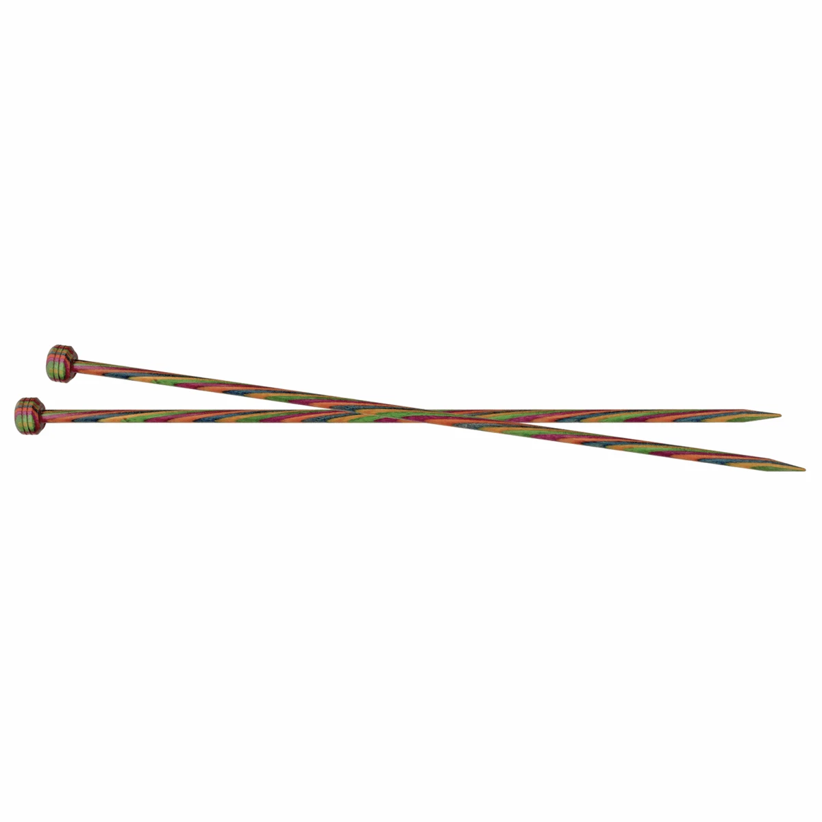 One pair of KnitPro 30cm Wooden Symfonie single pointed knitting needles.[Description][These popular multi-coloured needles are made from compact laminated Birchwood and provide a strong and durable finish. Smooth, sharp and tapered points are ideal for all knitting projects.