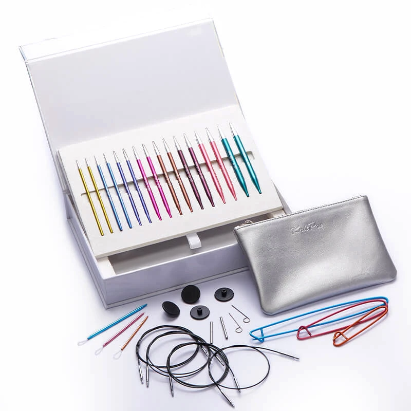 Set of 8 sizes of Zing Interchangeable Circular Needles (3.5, 4.0, 4.5, 5.0, 5.5, 6.0, 7.0 & 8.0 mm), 4 cables and assortment of accessories packed in a holographic foiled box. A grey soft pouch keeps the accessories safe and ready for all your projects.