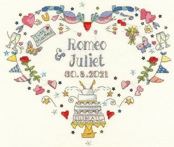Your kit contains; 14 count cream Zweigart Aida, pre-sorted stranded cottons, sequins, needle, stitch diagram and instructions.